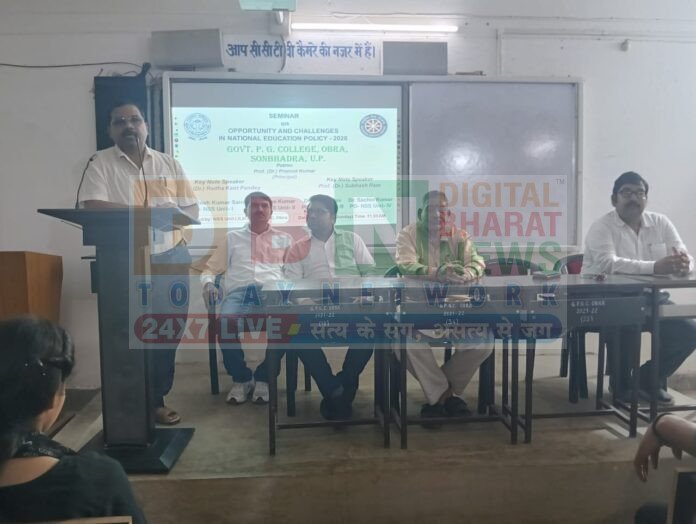 ओबरा/सोनभद्र।आज दिनांक 28 जुलाई 2025 को राजकीय स्नातकोत्तर महाविद्यालय ओबरा, सोनभद्र में राष्ट्रीय सेवा योजना की चारों इकाईयों के संयुक्त तत्वावधान में राष्ट्रीय शिक्षा नीति 2020 के लागू होने के 5 साल पूरे होने पर संगोष्ठी का सुंदर आयोजन किया गया, जिसमें भारी संख्या में छात्र-छात्राओं ने उपस्थित होकर कार्यक्रम के प्रति अपने उत्साह एवं गंभीरता को प्रदर्शित किया।महाविद्यालय के प्राचार्य प्रोफेसर डॉ. प्रमोद कुमार ने छात्र-छात्राओं को राष्ट्रीय शिक्षा नीति 2020 के 5 साल पूरे होने की उपलब्धियों के बारे मे विस्तार से बताया।उन्होंने बताया कि राष्ट्रीय शिक्षा नीति के 5 आधारभूत स्तंभ है,पहुंच,समानता, गुणवक्ता,सामर्थ्य और जवाबदेही। यह नीति सतत विकास के 2030 एजेंडे के अनुरूप है। इसका उद्देश्य स्कूल और कॉलेज शिक्षा को अधिक समग्र, लचीला और बहुविषयक बनाकर भारत को वैश्विक ज्ञान में महाशक्ति के रूप में स्थापित करना है।