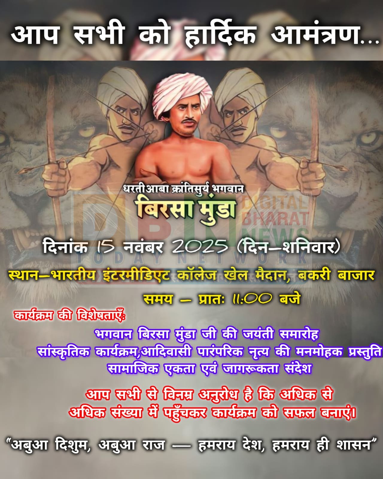 विंढमगंज। थाना क्षेत्र के भारतीय इंटरमीडिएट कॉलेज खेल मैदान में भगवान बिरसा मुंडा जी की जयंती धूमधाम से मनाने को लेकर राजा बरियार शाह समिति द्वारा भव्य कार्यक्रम आयोजित किया गया है। कार्यक्रम की शुरुआत भगवान बिरसा मुंडा जी के चित्र पर माल्यार्पण के साथ की जाएगी।