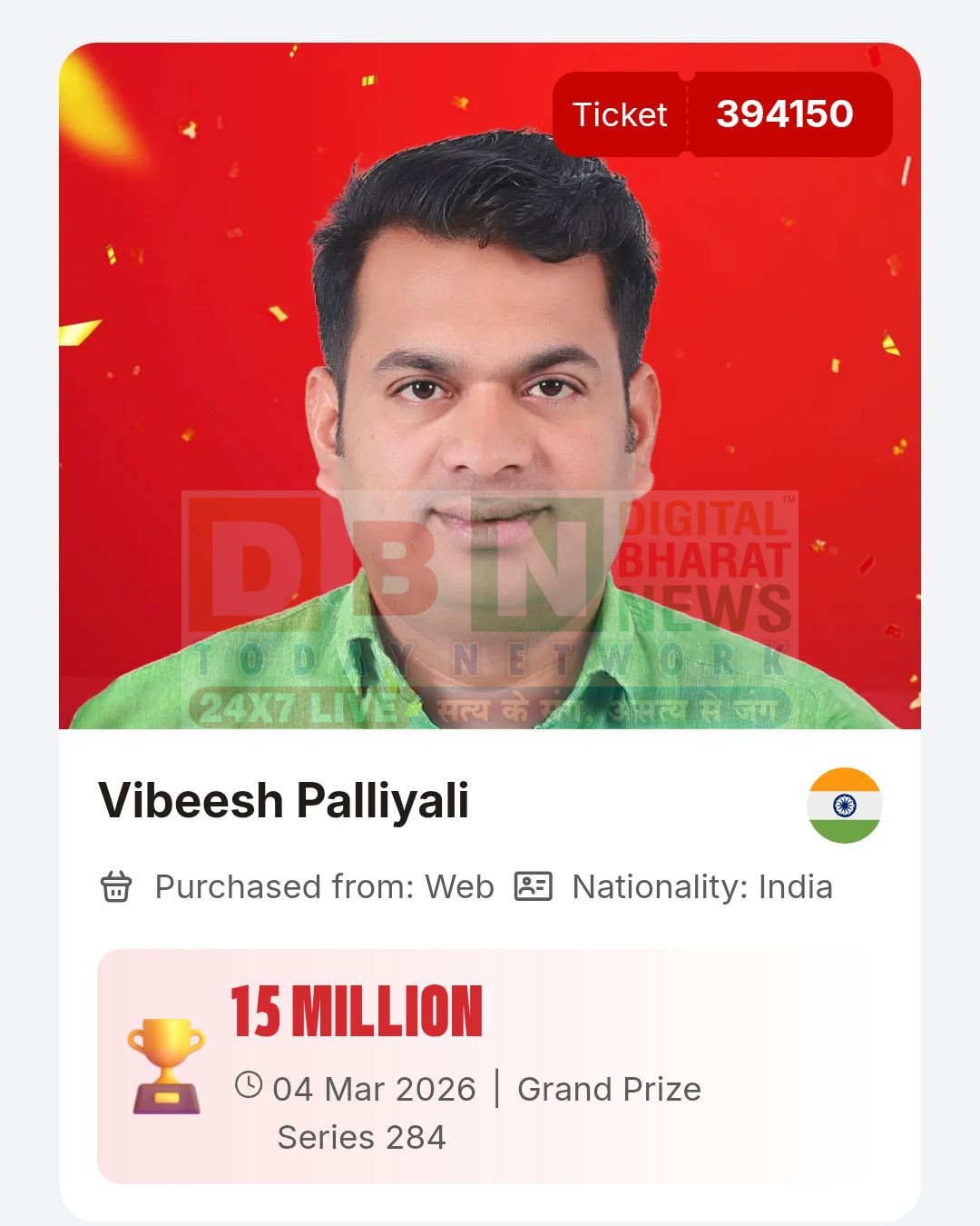 कहते हैं जब किस्मत मेहरबान होती है तो जिंदगी पल भर में बदल जाती है। कुछ ऐसा ही हुआ Vibeesh Palliyali के साथ, जिन्होंने “Win Cash & Prizes – Big Ticket Abu Dhabi” लॉटरी में AED 15 Million (करीब 33 करोड़ रुपये) का ग्रैंड प्राइज जीतकर अपनी और अपने परिवार की जिंदगी में खुशियों की नई रोशनी भर दी।